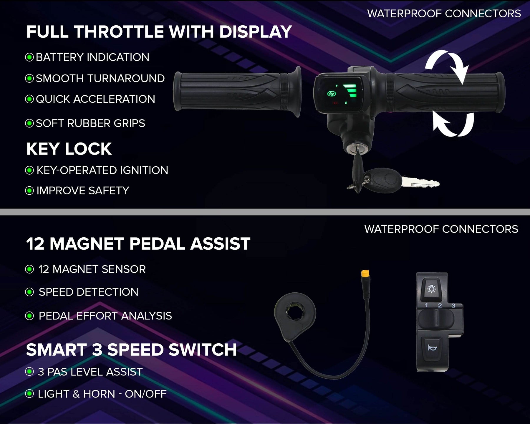 With a full throttle and a safety key lock, this 36-volt, 250-watt hub motor kit lets you adjust the motor's power while delivering a smooth boost. For easy pedalling, the 250w BLDC motor kit also has a dust-proof pedal assist system.