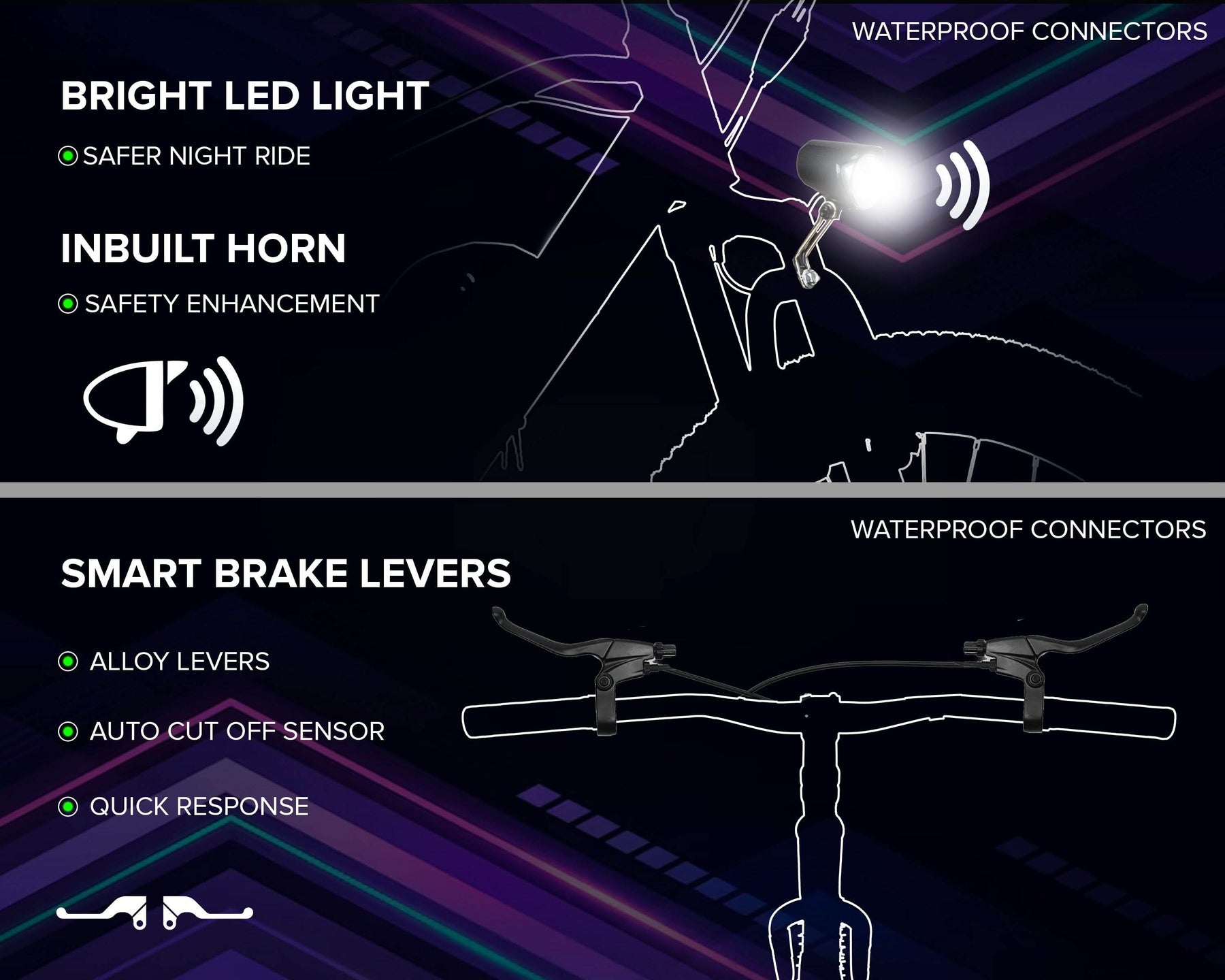 Geekay Bikes is conscious of how important it is to put safety first. For this reason, the cycle's 250w hub motor kit has an auto brake lever with an auto motor cut feature that makes sure the motor will switch off as soon as the brakes are engaged.